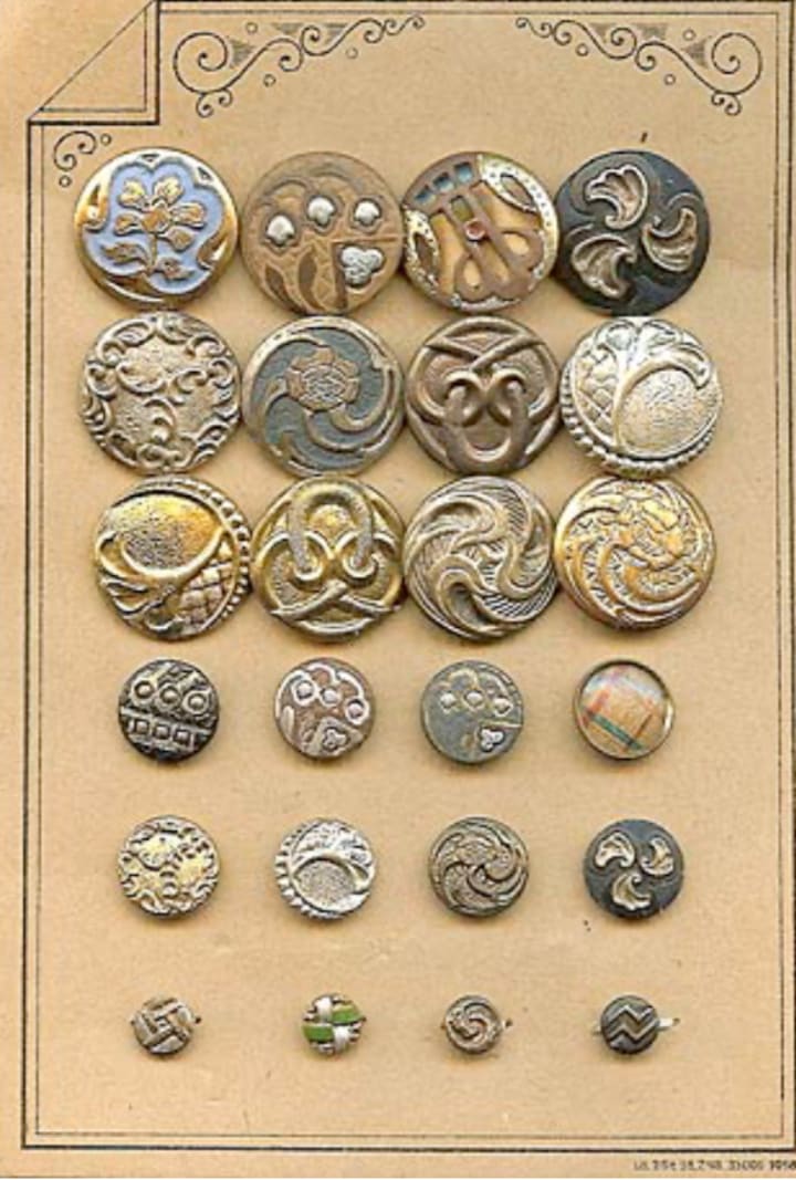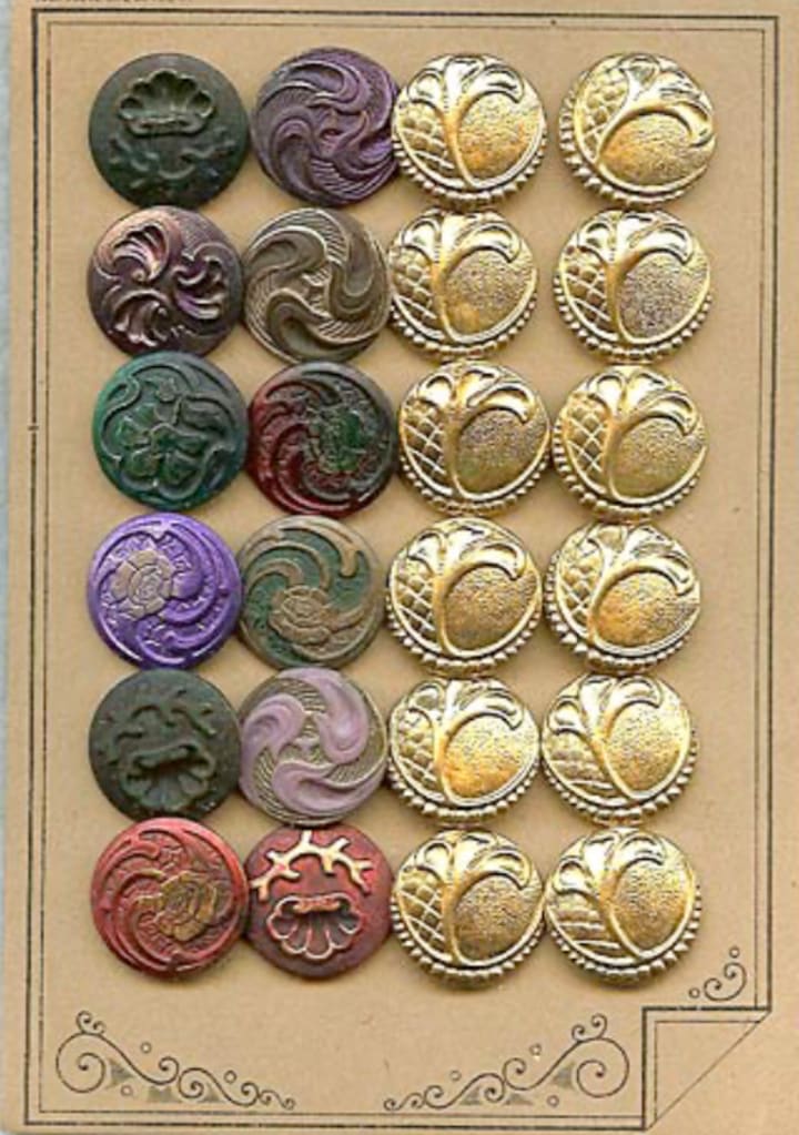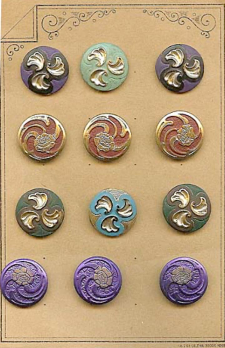 Being importers of glass beads and buttons from Czech Republic; and knowing the history of the makers of these buttons from our years of going to the region formerly known as Sudetenland, it was quite a surprise when a customer of ours showed us some metal buttons made in the same region but unknown to us. These buttons were made from non-ferrous metal. The buttons had various stampings, molded designs and colors fused on top and inside the designs, and some had painted coatings. They were quite lovely. The owner of these buttons happened to live quite close to us, and had a story to tell.