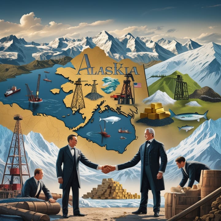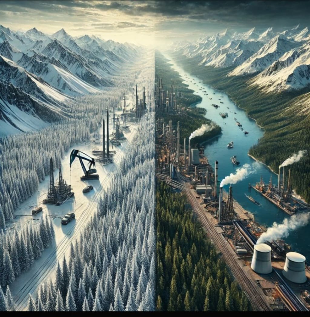 This image captures the natural wealth of Siberia and Alaska, showcasing their distinct yet similar landscapes. Siberia is depicted with vast forests, snow-covered mountains, and industrial mining sites symbolizing its oil, gas, and mineral resources. Alaska features pristine wilderness, oil pipelines, gold mines, and thriving fisheries, highlighting its economic potential. The visual contrast and harmony between these two regions underscore their global significance in resource economics.