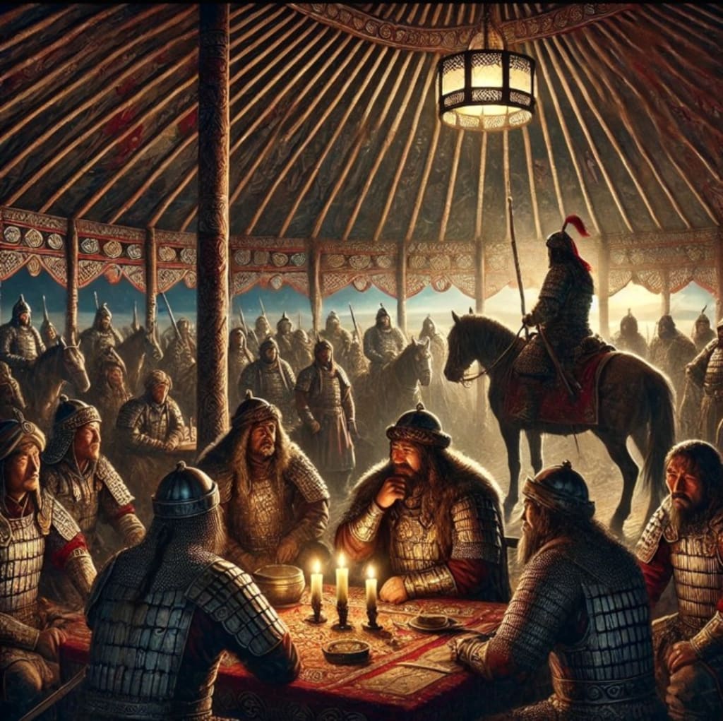 After the death of Genghis Khan, his generals and family gathered in a solemn council inside a Mongolian yurt, surrounded by dim candlelight and adorned with traditional decorations. The vast Mongolian steppe loomed in the background, a symbol of the empire he built. Warriors in detailed Mongolian armor stood in silence, reflecting on the future of their great leader’s legacy.
