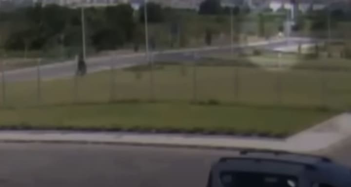 The final images recorded by the cameras show him running toward the surrounding woodland—disappearing from view and into the trees.