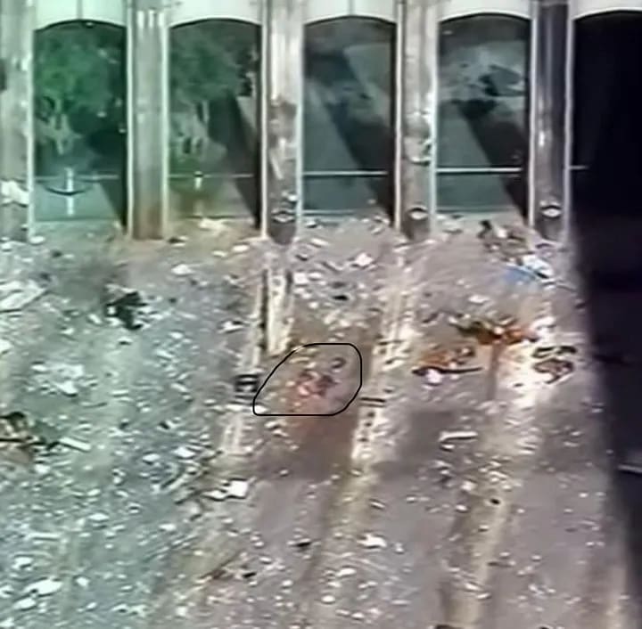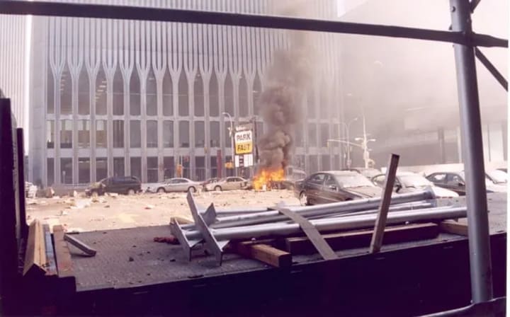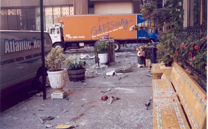 Images of the area around the Twin Towers show how devastating the scene is bodies parts and debris scattered across the streets and buildings.
