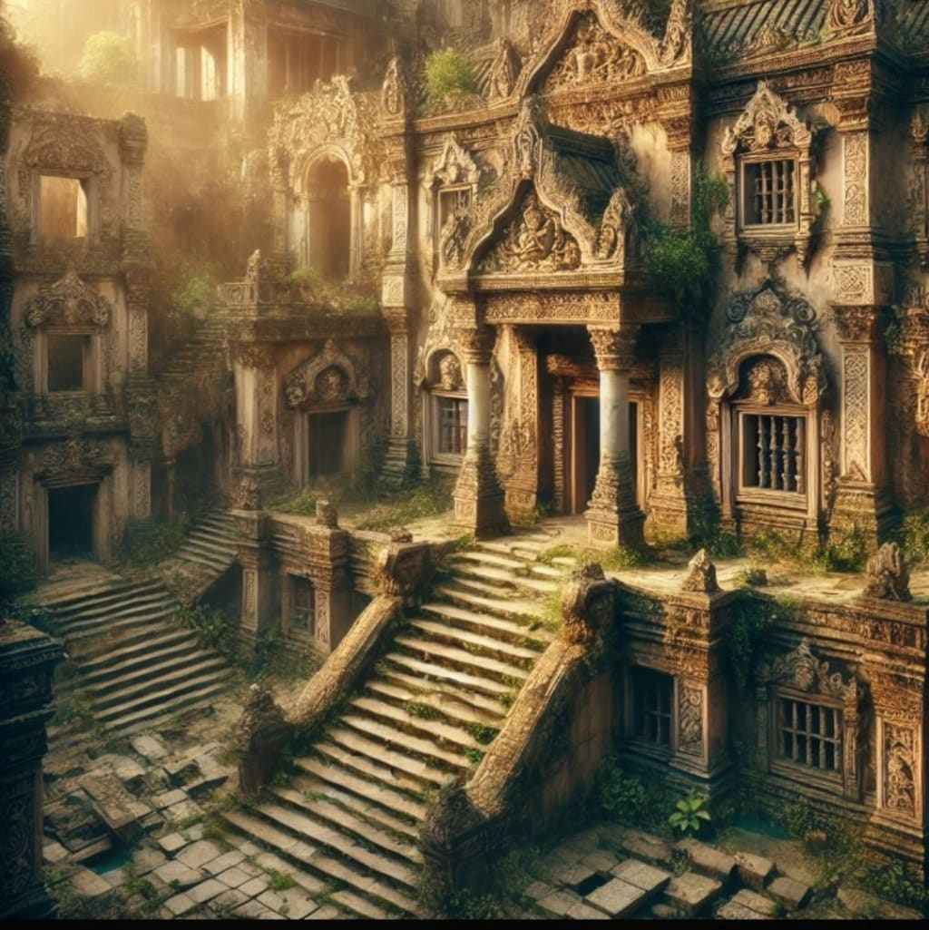 Once a symbol of grandeur, the palace now stands as a haunting reminder of a glorious past. With intricate carvings and faded murals, its weathered walls are overtaken by creeping vines and moss. Broken pillars and collapsed rooftops add to the eerie beauty of the ruins, while the golden sunlight casts a mystical glow, evoking the lost stories of those who once walked its halls.