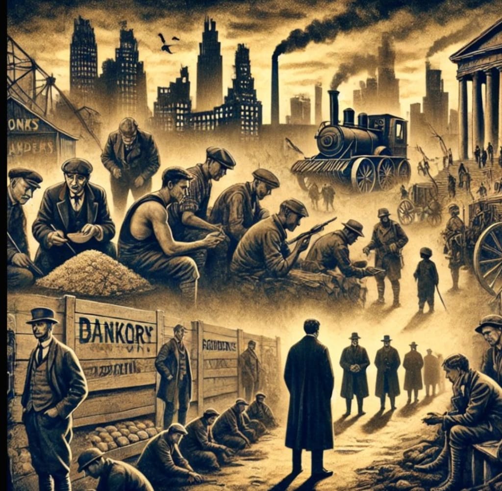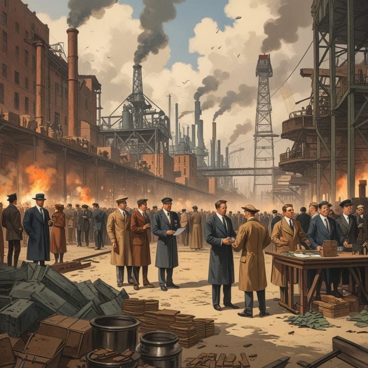 This image illustrates the financial consequences of World War I, featuring war-torn cities, struggling industries, and citizens in bread lines. It highlights the economic strain on nations, post-war reparations, and the emergence of new global powers. Let me know if you need any modifications!