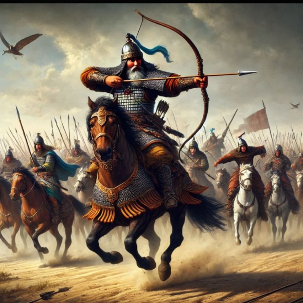 This image captures Genghis Khan leading his Mongol warriors into battle with unmatched intensity. Mounted on horseback, he wields a curved sword, commanding his cavalry as they charge forward. The dusty steppe in the background sets the stage for one of his legendary conquests, while archers release arrows in perfect formation. This scene highlights the discipline, power, and strategic brilliance that made the Mongols unstoppable on the battlefield.