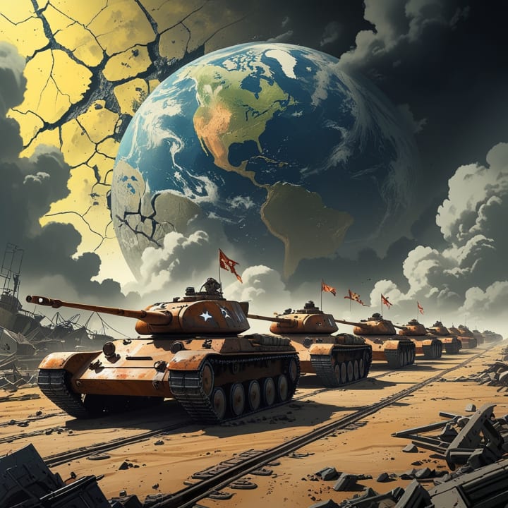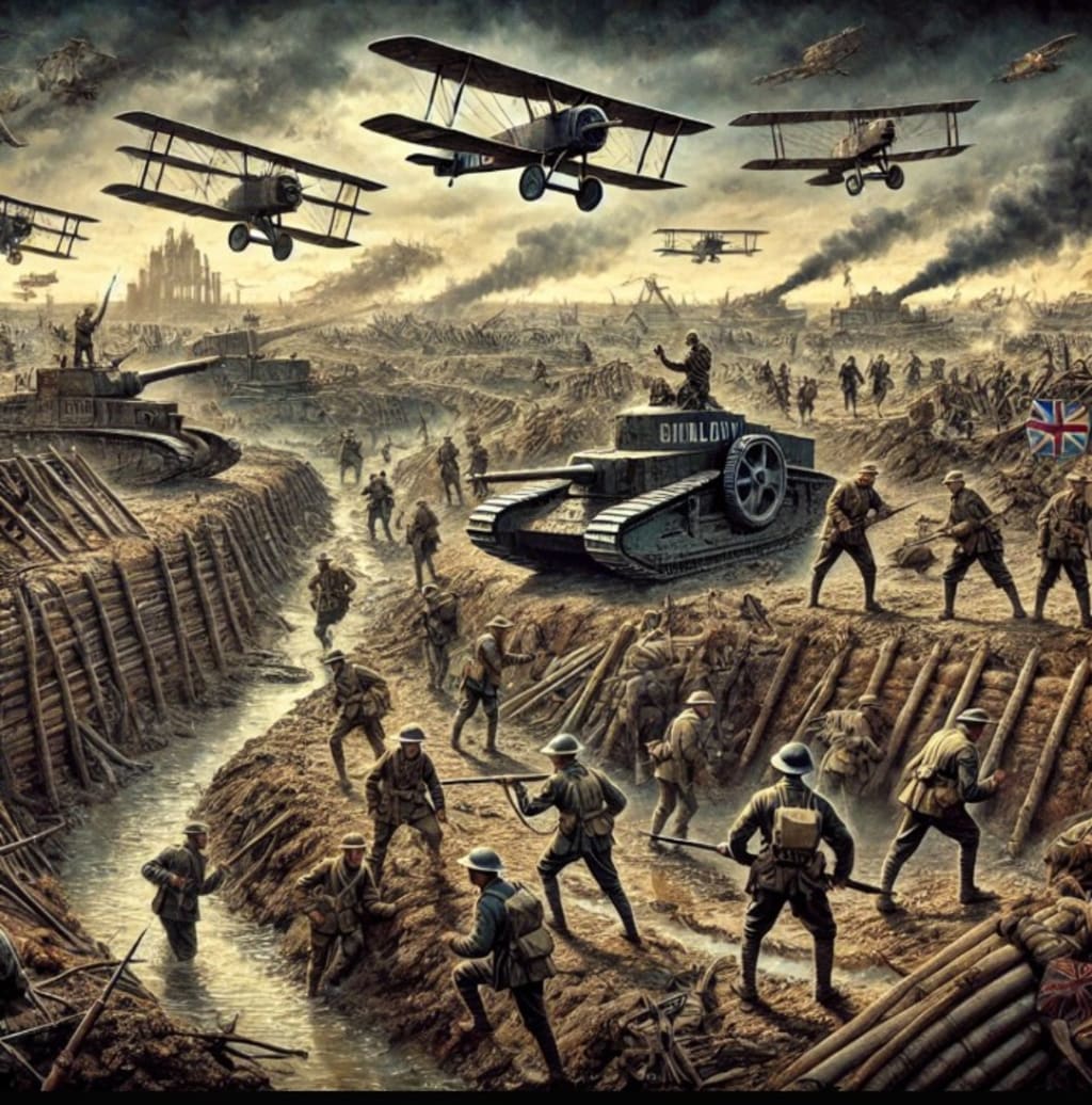 A Visual ChronicleSummary: This illustration captures the intensity and devastation of World War I's major battles. It portrays trench warfare, massive artillery bombardments, and aerial dogfights between biplanes. The image also highlights key events such as the Battle of Verdun and the Battle of the Somme, featuring tanks rolling across the war-torn landscape and soldiers enduring gas attacks. The dark, smoke-filled atmosphere emphasizes the brutal reality of one of history’s most destructive conflicts.