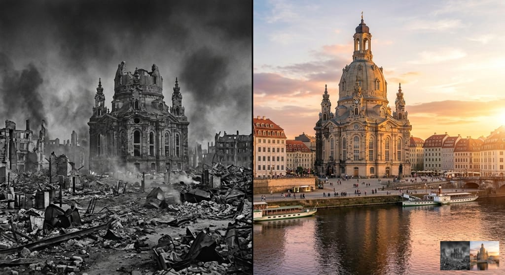 Perhaps the most remarkable part of the Dresden story is its physical and spiritual reconstruction. For decades under East German rule, the ruins of the Frauenkirche (Church of Our Lady) stood as a blackened memorial to the horrors of war.
