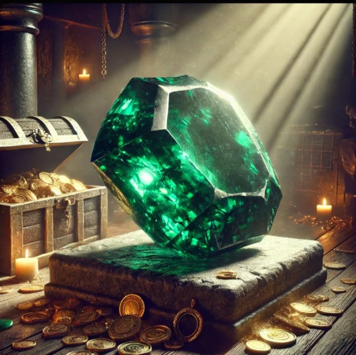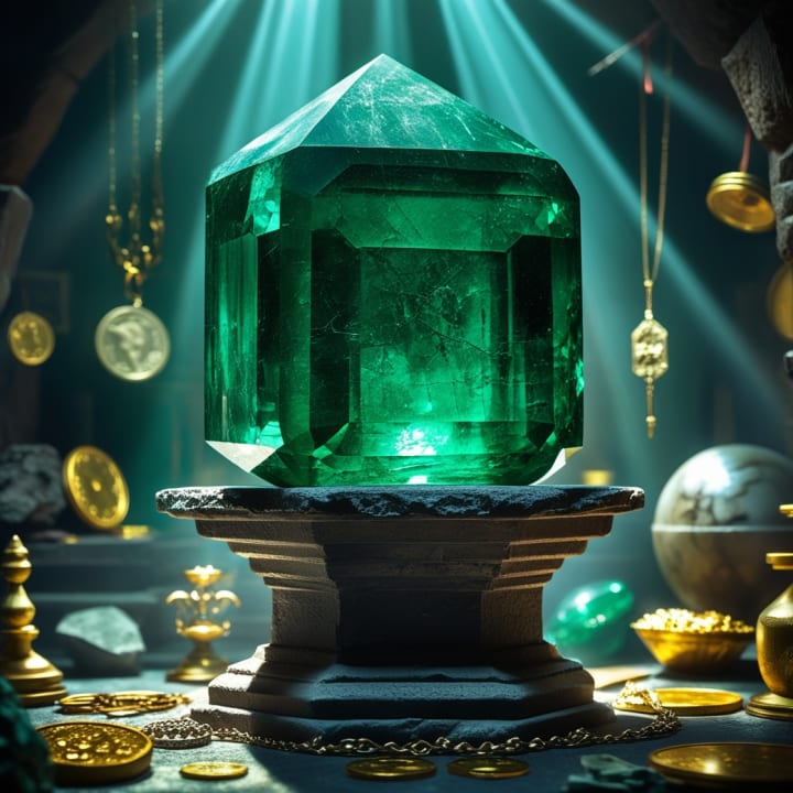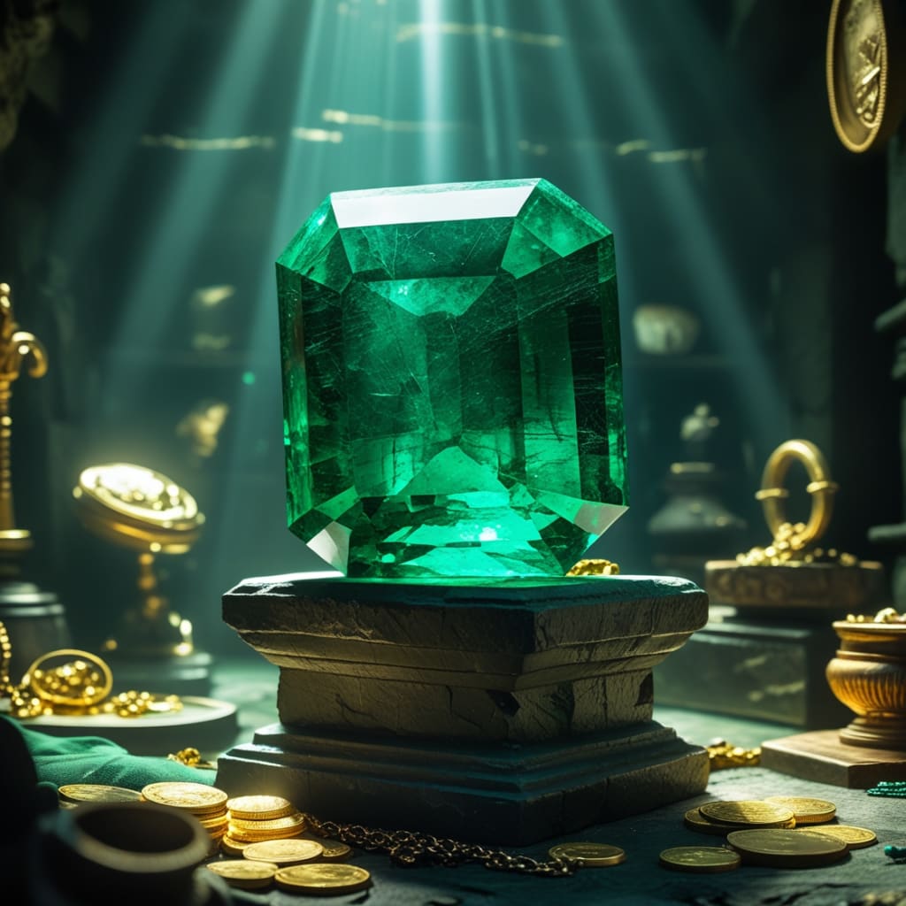 This image depicts a breathtaking scene of a massive uncut emerald, glowing with a deep green hue in a dimly lit treasure chamber. Placed on an ancient stone pedestal, the emerald is surrounded by gold coins, jewelry, and historical artifacts, evoking a sense of mystery and discovery. The beams of light shining onto the gemstone emphasize its immense size and value, making it look like a long-lost treasure waiting to be revealed.