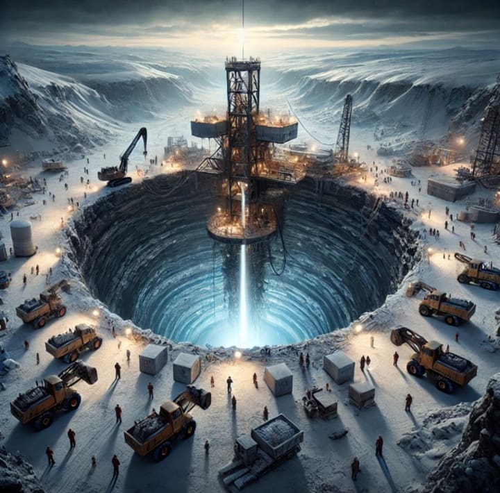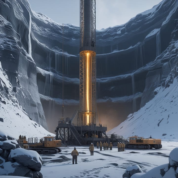 This image captures the monumental Soviet-era scientific endeavor of the Kola Superdeep Borehole. Set in the snowy wilderness of Siberia, the drilling rig stands as a testament to human curiosity and determination. The borehole, surrounded by machinery and workers, symbolizes the quest to explore Earth's depths. Glowing light from the borehole reflects the mysteries uncovered, from ancient rock layers to extreme temperatures, making it a landmark in geological exploration.