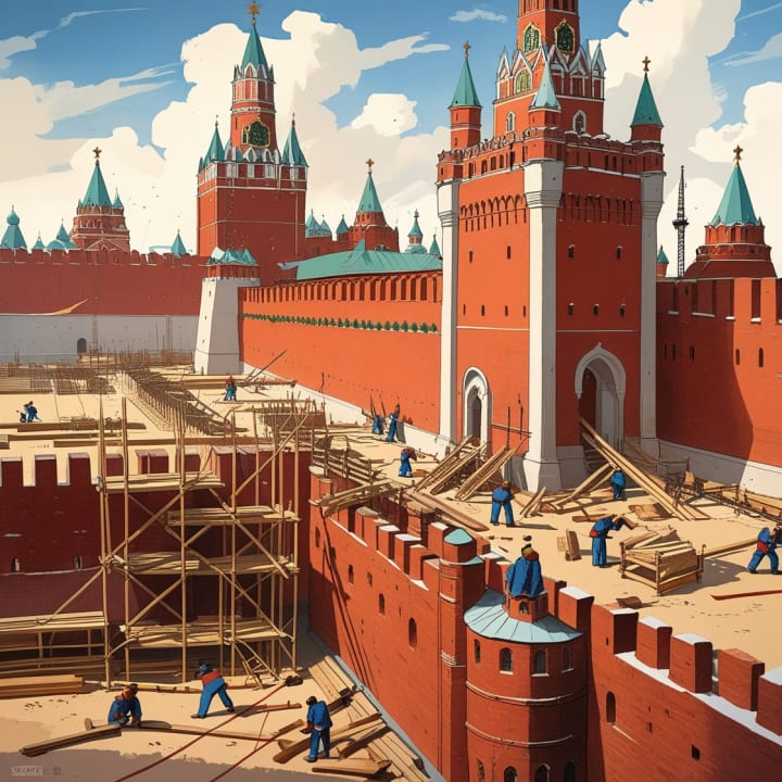 During the reign of Ivan III, the Kremlin underwent a massive transformation into a grand fortress. This illustration depicts the construction process with workers laying red bricks, towering walls rising, and nobles overseeing the development. The once modest citadel became a symbol of Russian power, solidifying Moscow as the heart of the Tsardom.