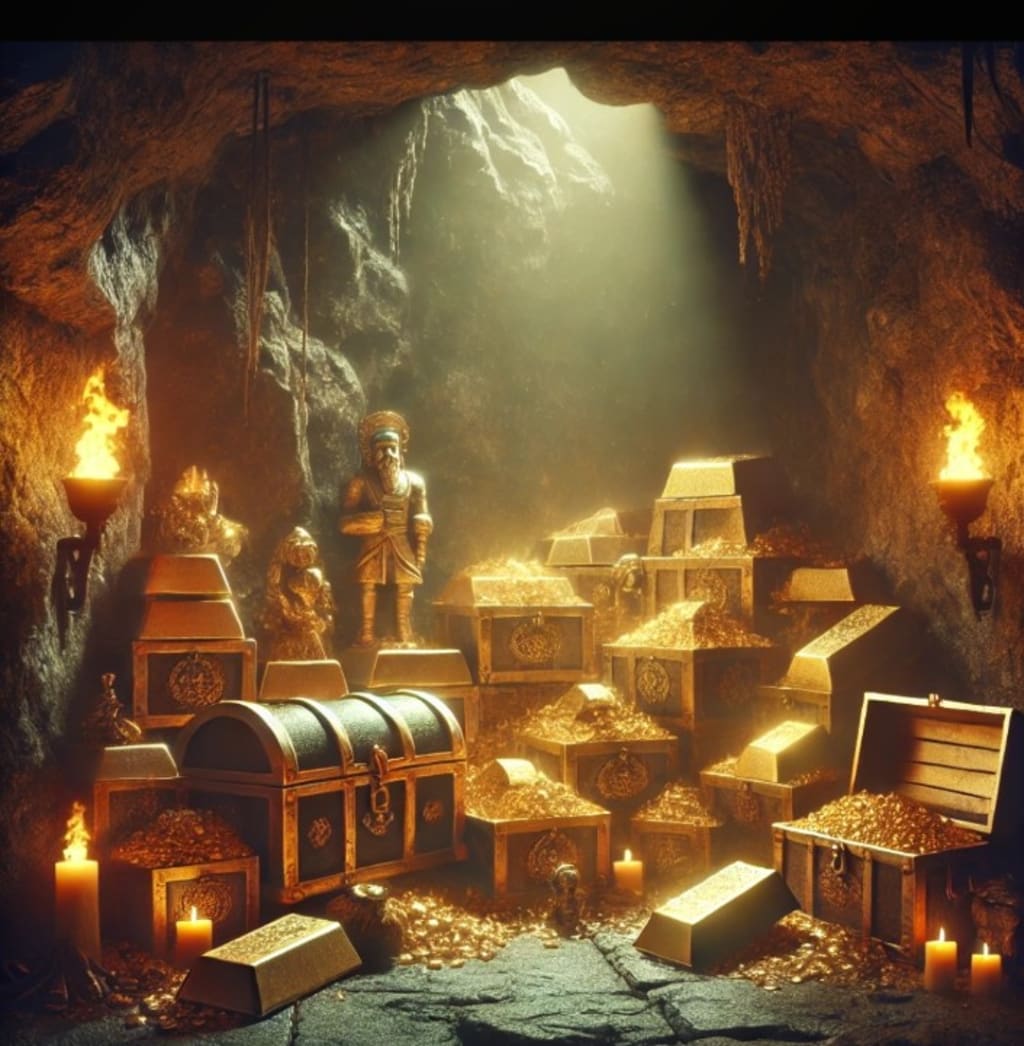 This illustration represents the legendary Yamashita’s Gold, an alleged hidden fortune buried by Japanese forces during World War II. The scene showcases a mysterious underground cavern, filled with gold bars, ornate chests, and ancient artifacts. Dimly lit torches cast eerie shadows, emphasizing the secrecy surrounding this lost treasure. Many believe that vast amounts of gold remain hidden in tunnels throughout the Philippines, waiting to be uncovered.