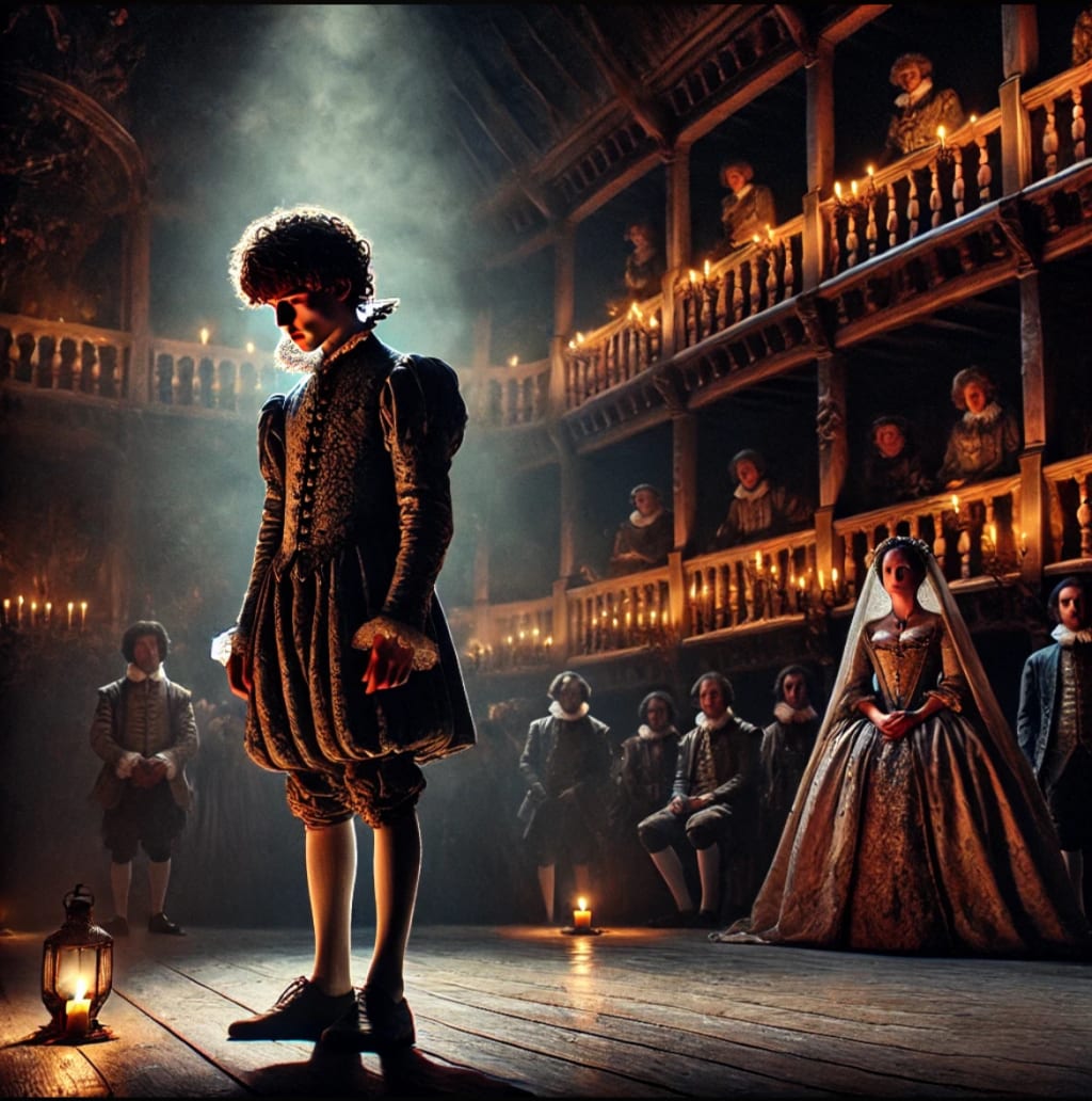 A dramatic Shakespearean-era scene in the dimly lit Globe Theatre. A small-statured male actor with a childlike frame but the face of a man stands alone on stage, delivering a sorrowful monologue in an ornate Elizabethan costume. His hunched back and delicate form are illuminated by flickering candlelight. In the audience, a veiled noblewoman watches him intently, her posture tense with longing and sorrow. The darkened balconies loom above, casting eerie shadows, evoking inevitable tragedy and forbidden love.