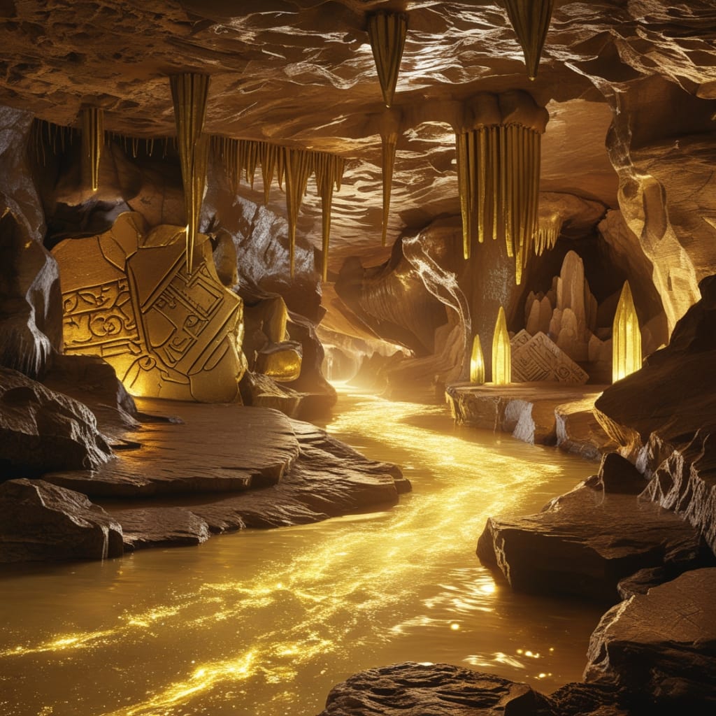 This illustration depicts the legendary underground gold river, a tale that has fascinated generations. The glowing golden stream, surrounded by glittering stalactites and ancient carvings, symbolizes the blending of history and myth. While no such river has been confirmed, this artwork reflects the enduring allure of hidden treasures and the mysteries they hold beneath the earth's surface.