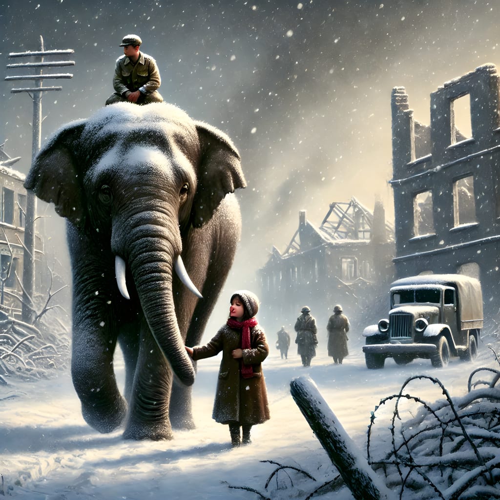 Eventually, they find temporary shelter in a farmer's barn. The farmer is reluctant to let an elephant into his space but quickly finds himself succumbing to Marlene's gentle ways. As the war threatens to overtake them all, moments of tenderness abound, reminding Lizzie and her family of the enduring power of kindness.