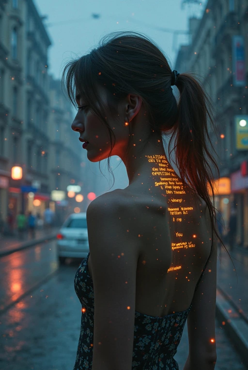 She sat up. Her name? Anna—probably. The reflection in the mirror was hers, and yet her brain felt like it was booting up for the first time. On the back of her neck, faintly glowing blue text scrolled like code: