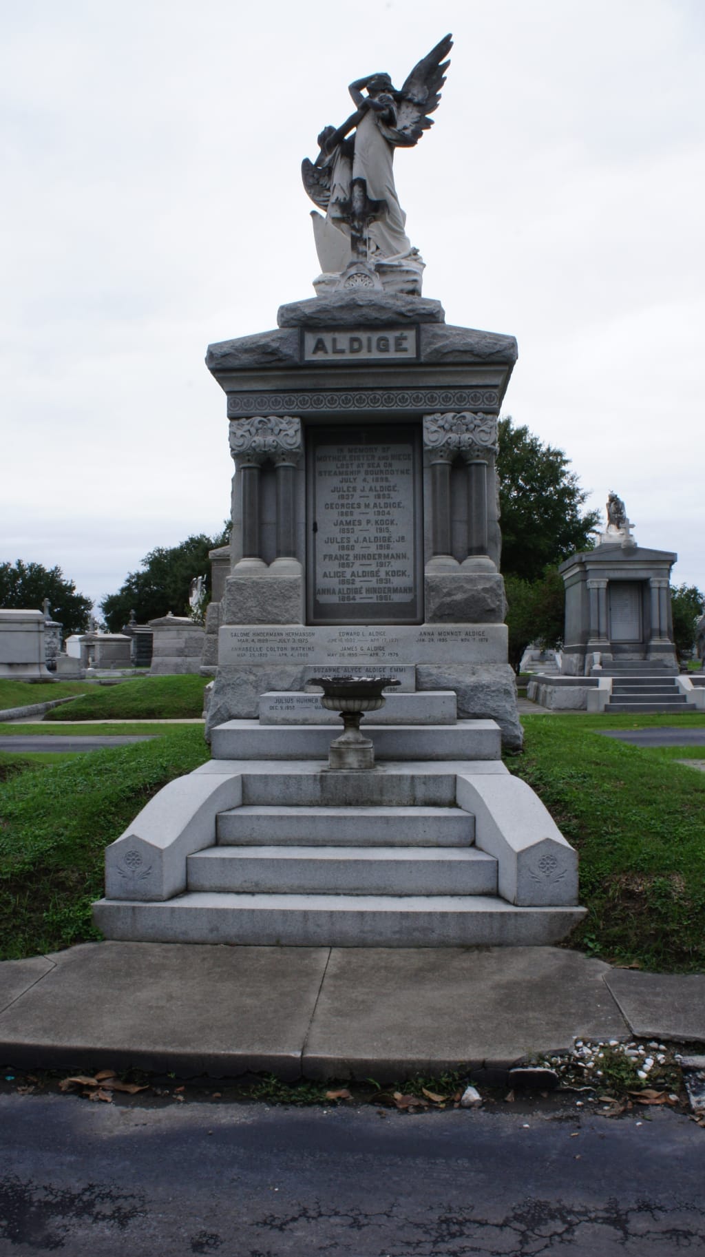 I knew my third great grandmother on the Aldige side, Alice Lepretre Aldige, died in a shipwreck with a daughter and granddaughter (see linked text for an article). That is commemorated on the monument. I also previously found out, through ships' logs, that the ship she died on, in the 1898 shipwreck, the same ship she brought her husband's body back from Paris on in 1893. I just found out that it gets creepier and more Gothic than that.