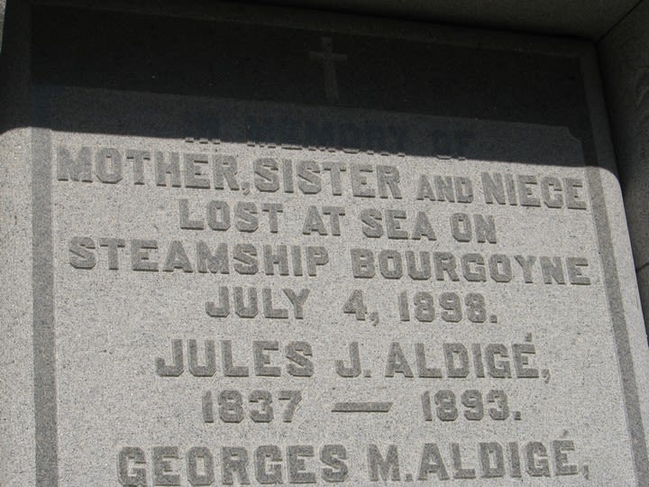 To continue with the story getting creepier, the family who met Alice, the Bordes, and Jules' body in NY, George Aldige and Mr. and Mrs. Walter Cook? George A. would die in 1904 of TB. Mrs. Walter Cook (Marie Leonie Aldige) died in May of 1894 (they had only been married since 1893). Only the non-Aldige, Walter Cook lived to any great degree afterwards (1870-1935). I am happy to report, though, that my Aldige (Anna Aldige Hindermann, variously the daughter, older sister, and aunt of those lost on La Bourgoyne) lived from 1864-1951.
