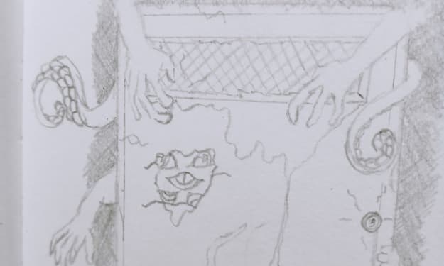 Carla noticed Josh twitching as he repeated saying “Tick”. She tried to console her brother. She hugged him tight telling him how much she cares for him. She didn’t notice the light green mist filling the room. She didn’t notice Josh’s eyes white out and enlarge. The left eye twisted and swirled in on itself. The right eye sank in, collapsing, giving way to see through his head. His body was glitching with blue and black tv static spreading from his forehead to his feet. His head tilted to the side, tick. Carla looked at him. She started to hear roaring static.
