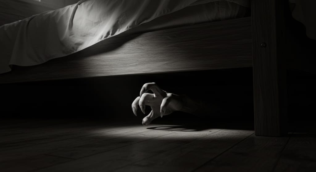 As they left the bedroom, Sergio turned out the light and closed the door behind them. He hadn’t noticed the evil clawed hand, half sticking out from under the collapsed bed frame, crushed and lifeless.