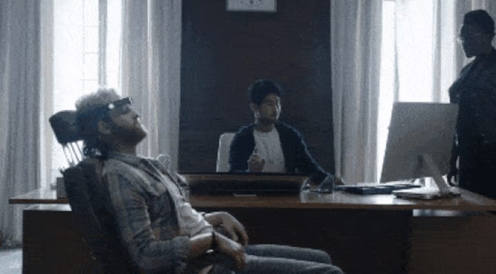 The Paranormal Activity series prides itself on the security footage schtick – more recently picked up by American Horror Story Season 6. As we watch Cooper slowly lose his mind, the company observe from the safety of their lab. While Cooper sees the horrific apparitions in front of him, there is no sign of that for Wunmi Mosaku's character and her team. Here, Brooker totally harps home the whole "Big Brother is watching you" mantra!