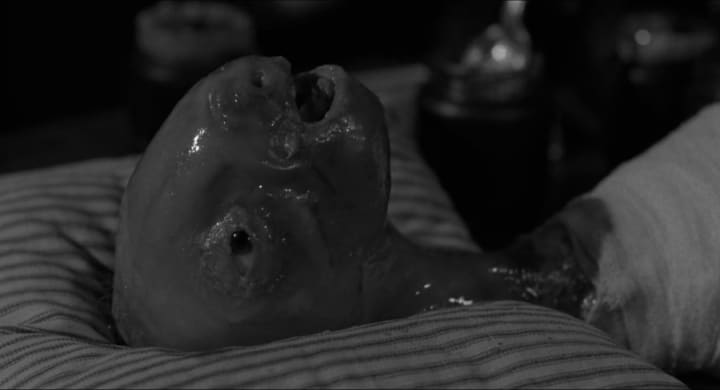 Henry goes crazy, and kills his own kid. After he does this monstrous act, he starts to see visions of the baby's head, appearing to him in his apartment. This part was so scary to see, and I did not think I was going to get that creeped out. I was still trying to process what he did, and that particular vision was the only one that actually got to me.