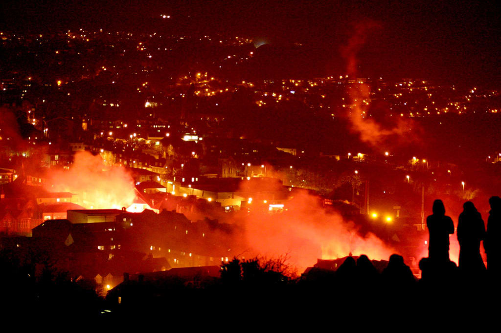 The town was consumed in an inferno. Those who were unlucky enough to be touched by it were screaming in pain and pleading for a mercy that they would eventually grow to learn would never come. A trail of bloodied bodies that were either dead or dying lead to the source of the chaos. He continued to walk slowly without a hint of remorse, as he looked around at the outcome of what he started; he knew the denizens of the town would make a bigger mess in a heap of panic, and he initially just gave them a push, but decided to have some fun amongst the chaos.