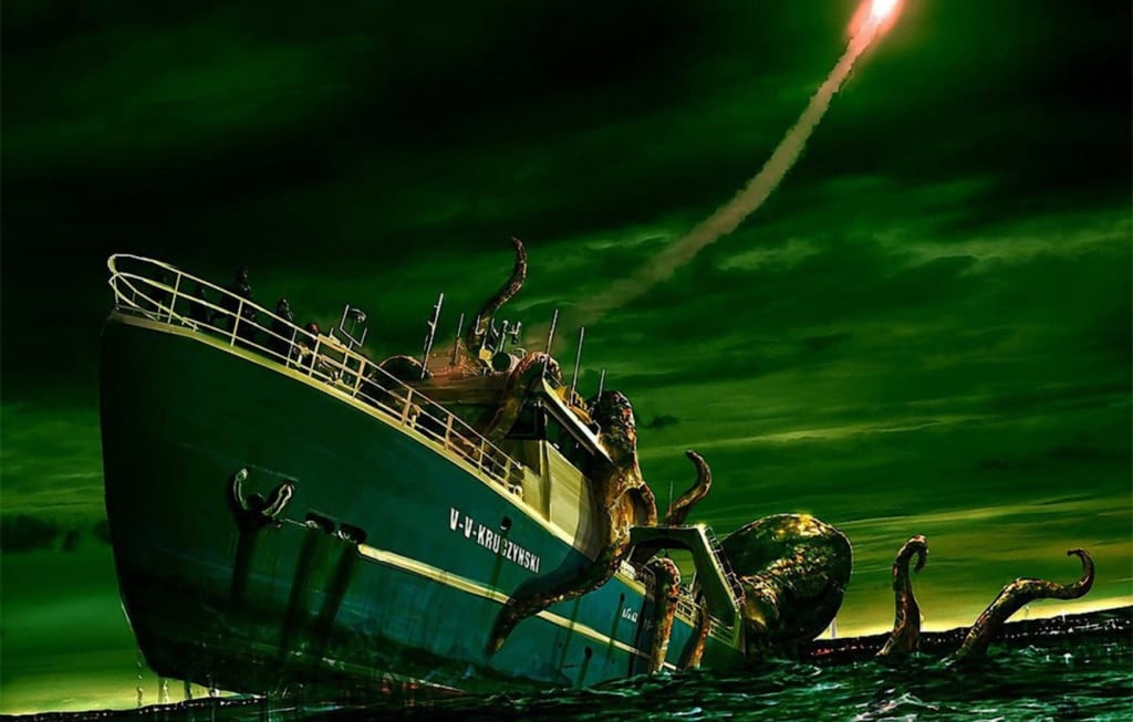 Not a single wave drifted by it was as if time stood still and we were in the land of nowhere. I heard the whaling cries out at sea, and it was creepy. The cries seemed to have sounded louder out on deck, only this time I heard a splash from the water. It sounded like a large mammal had risen to the surface for air. Now at this moment, I am not sure why but deep down something inside of me believed that whatever was in the water was responsible for the cries at night, this, “it” was the reason we were stranded at sea. I got up and took two steps towards the top railing; the noise stopped. The sound of silence sliced the air. Then, out of nowhere the ship rocks. This was not a gentle rock due to ocean waves but rather the ship rocking as if the ocean floor underneath were to collapse. As the rocking subsided, I regained my footing and slowly made my way towards the railing again only this time I stopped dead in my tracks. I was completely stricken with fear when I saw what looked like a huge tentacle unwrapping itself from the side of a lower railing. “Oh. My. God!” Now I did not shout this out loud, but apparently my voice was loud enough for one of the crew members on a nightly patrol to hear me.