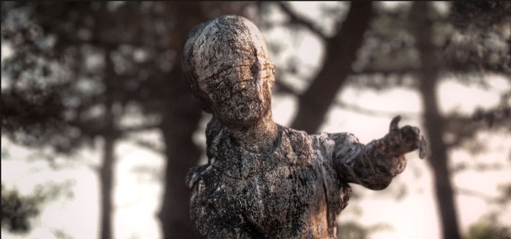 Her grieving parents, shattered by the loss, built a stone statue of their beloved Magda on the very spot where she had died. Some say they even buried her body beneath the stone figure, eternally marking the place of her tragic death. The statue now stands old and weathered, its surface cracked and worn. Dry vines snake through the crevices, depicting her wearing the blindfold, her hands outstretched as if forever reaching for the seeker or the help she never found.