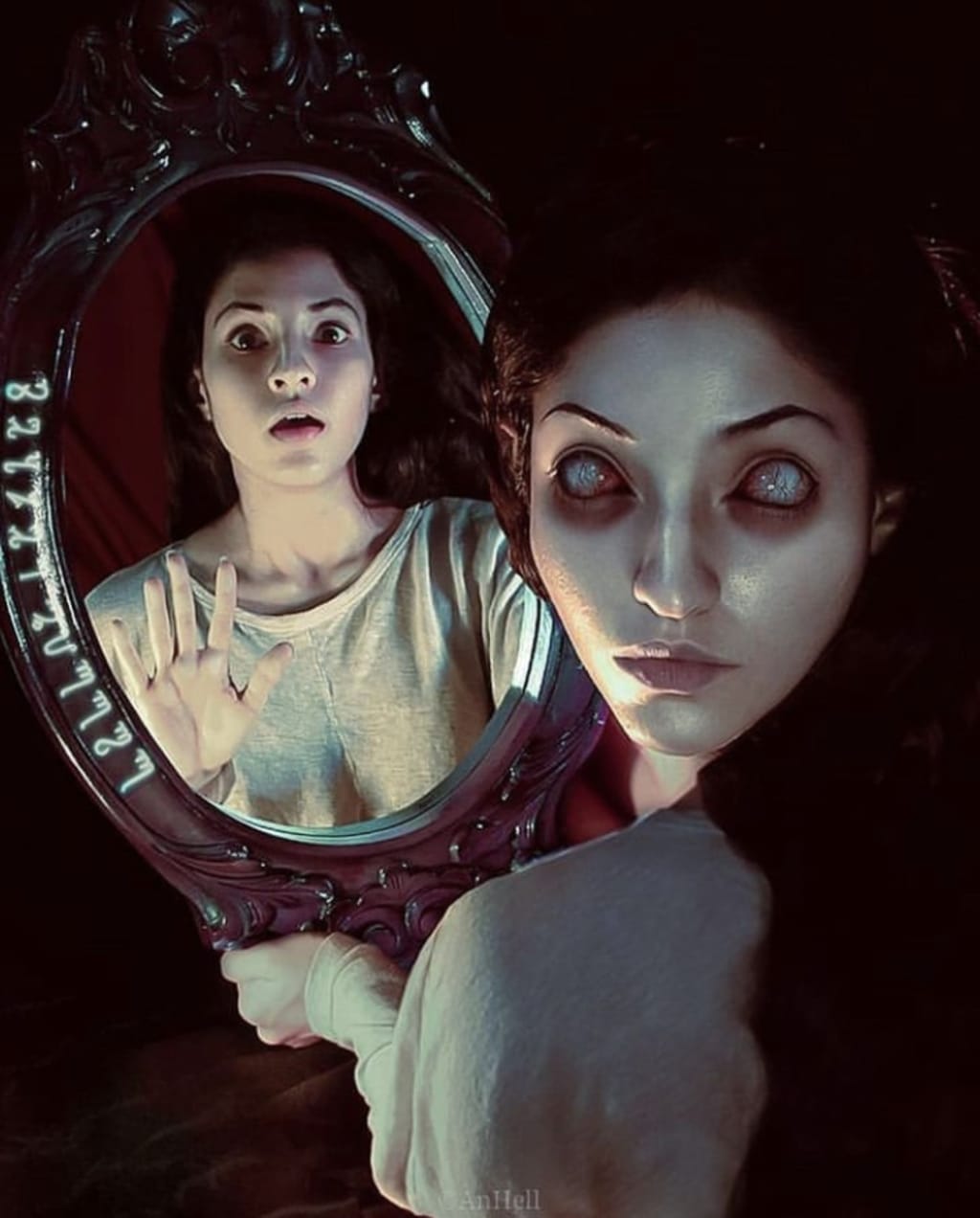 “Do you know how many more souls I’ll get looking like you? Stupid girl, you should’ve never looked in the mirror. Now you’ll be there for all eternity and I will be free. I almost thought I was you. Almost forgot what I was. But my true nature couldn’t be contained. Now everything you thought was yours, is mine. Your soul belongs to me. Your name belongs to me. Your face belongs to me. I am now more wicked than ever. You should’ve listened to your mommy. You should’ve never looked in the mirror. You let out the demon".