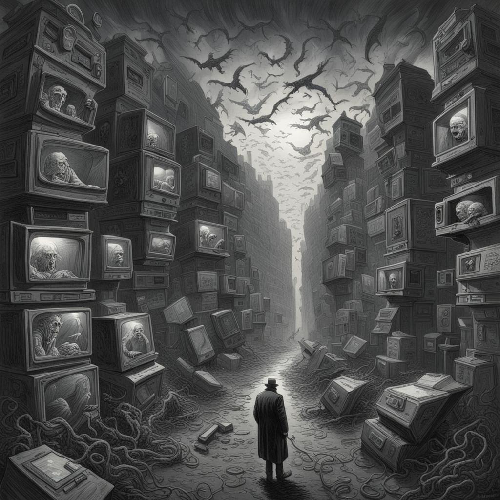 You are in a strange grey maze made up of old broken fridges and old cathode ray televisions. Although nothing is plugged in some of the televisions have pictures and some of the fridges have doors either missing or open and on their shelves are rotting meat crawling with maggots and vegetables and fruit that has turned to a black mush.