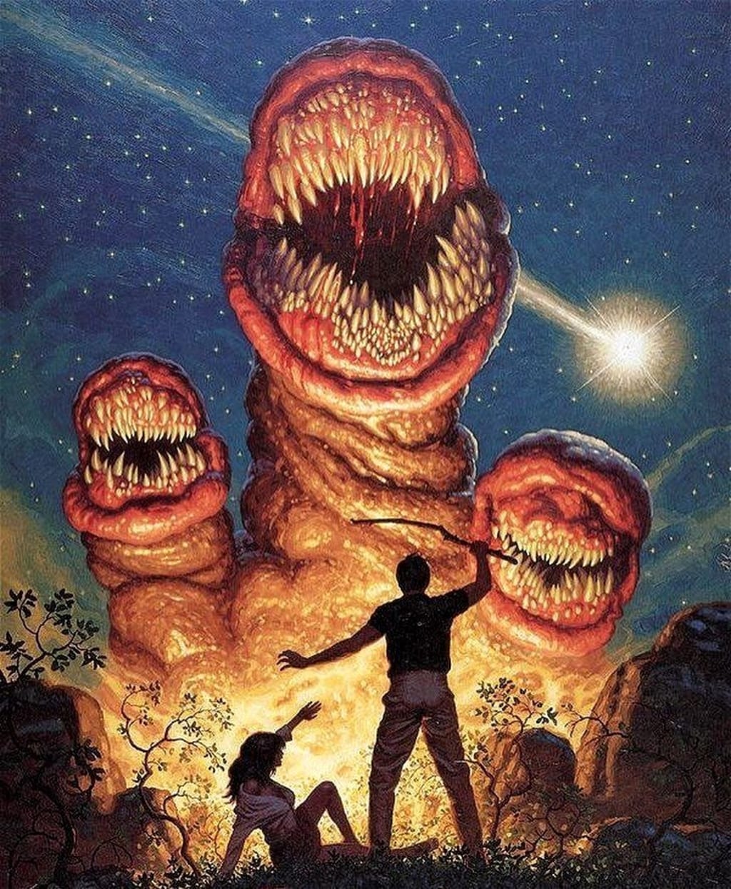 A couple gets eaten by the alien, who came in on a comet or meteorite (the prolog features two campers who, much like the ill-fated Jordy Verril in Creepshow (portrayed so excellently by Stephen "Steve-O The King" King, whose character becomes a walking second-cousin to Swamp Thing), find a meteorite they are too clueless to just leave alone. Out comes the alien, who is like Audrey in Little Shop of Horrors, but with rings of sharp splatter movie alien teeth.