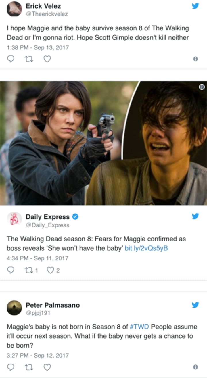Without speculating too much, it's reasonable to assume there's a major implication to what Gimple is saying about Maggie and her child not being born. Gimple's comments may not mean Maggie's child will die like some sites have suggested, but it's one scenario that is feasible at the moment. Only a few fans have chimed in so far, but the consensus is that the baby won't survive. Here are some of the tweets on the matter: