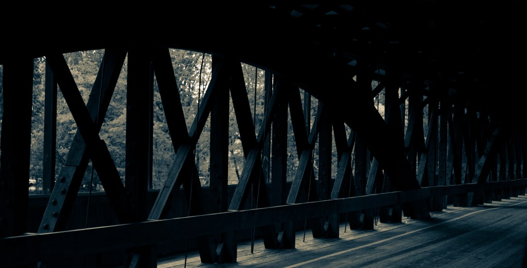 Though she’d never admit it, she had made herself anxious rattling off the old legend of the doomed prom queen who was rumored to haunt the covered bridge down the way. Preying on morons dumb enough to park in the darkness, appearing in rearview mirrors with a devilish smile before enacting her revenge.