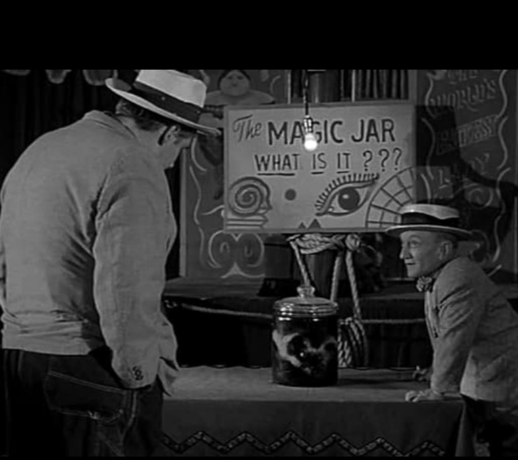 The Alfred Hitchcock Hour ran from 1962-1965 on CBS. An episode in 1964 titled The Jar was truly suspenseful because it left so much to the imagination. Pat Butrum, (Mr. Haney in Green Acres) is Charlie Hill a small town farmer. He goes into town and visits a carnival where he sees a magic jar. Billy Barty portrays the carney who entices people to guess what is in the large crockpot size glass container.