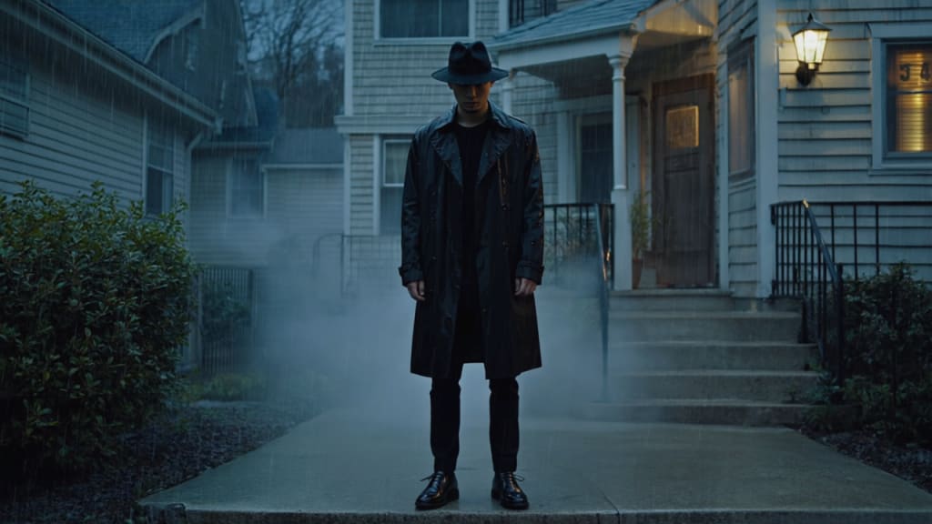 When I opened the door, he was there — tall, motionless, and dripping rainwater onto the welcome mat. His coat looked heavier than it should have been, and the brim of his hat cast his face in a darkness deeper than the night itself.