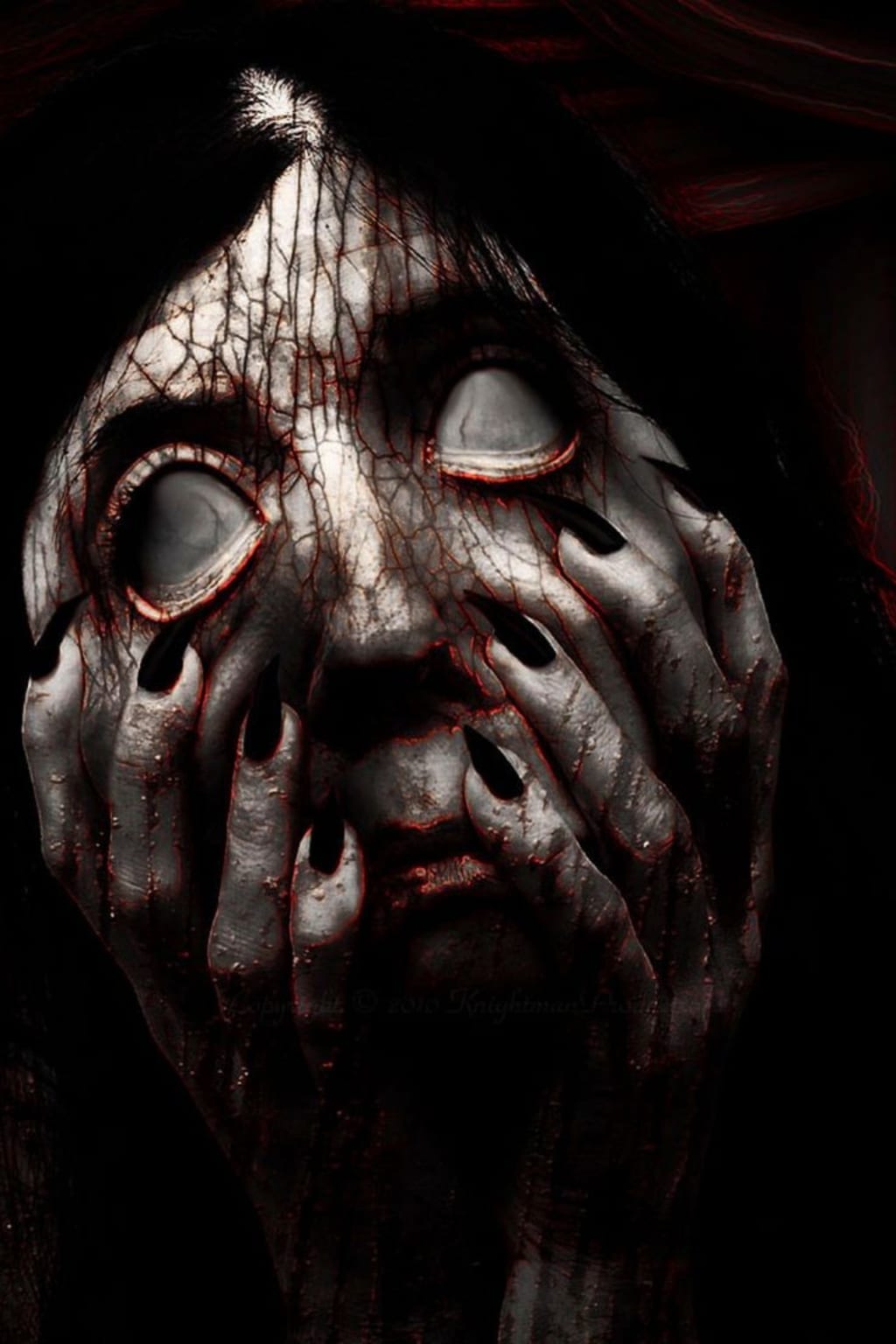 The girl’s head snapped up. Her eyes were gone. Just two gaping sockets leaking black tears.