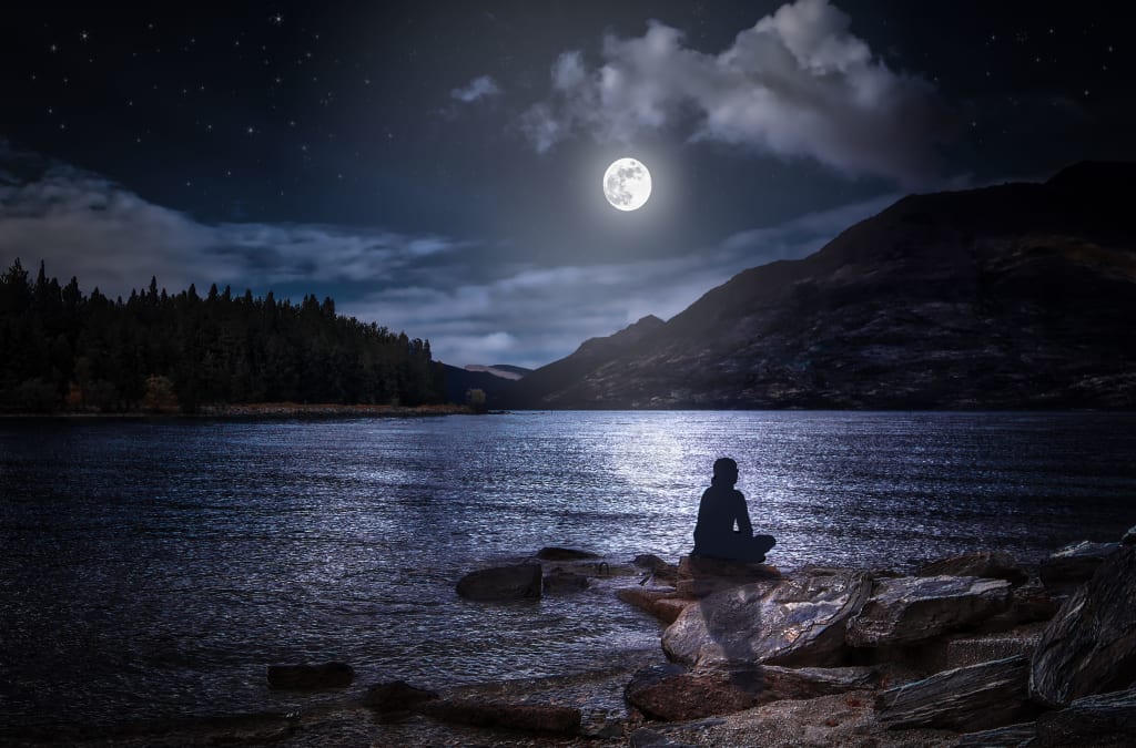 After a few minutes, and with thoughts of anger and regret burning in his brain, he emerged from the brush into an open clearing and there he stopped. He stood at the mouth of an alpine lake that was almost perfectly round in its circumference, and as still as it was hauntingly tranquil. The way the moonlight danced over the entire area made the landscape look not of this world; as if he stepped out on to another planet. He gazed across the mirrored lake, which held all the reflections of the surrounding mountains in its canvas, and he sighed.