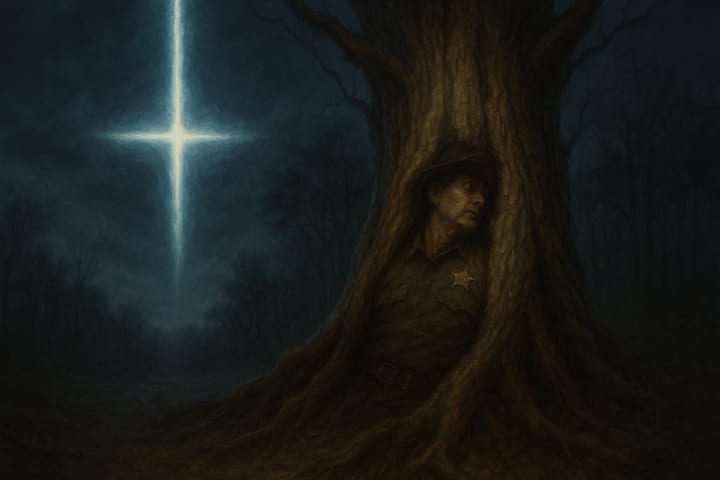 The sheriff's body was found inside a tree, as if grown into it. A cross of light opened in the sky, not bright but deep an incision across dimensions. From it came a soundless song, understood not with ears, but with marrow.