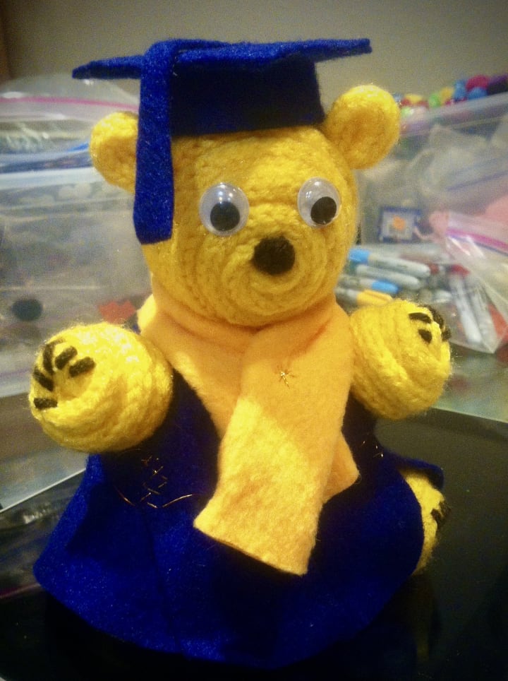 And then it was graduation time! A new request was made — a gift for a Berkeley college graduate, a Golden Bear… The request made me think for a while, and then I added a golden thread to the yellow yarn before weaving the rope. It was not overwhelmingly shiny, but with just a touch of gold added to the softness of acrylic yarn. Dressing the Bear was a whole different story! I made a dark blue cape, but the graduation cap would be a perfect finishing touch to the image! The question was, how to make it? I cut out a square for the top, and then added a rectangular stripe — long and narrow, I had to cut it in one move so the edge would be perfectly straight — luckily, my scissor blades were long enough to accomplish that task. And then I found a lid of a plastic vitamin bottle to form the perfect circle and used glue gun to attach it to the square top… easier said than done, I made 3 (or 9? Who counts?) trial hats before it was the way I wanted.