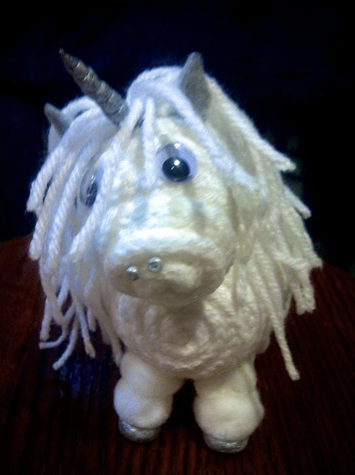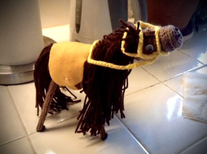 All my animals were based on the styrofoam balls, so round was the default shape. And then someone requested… a horse! Well, that was a real challenge to my creativity! Used to putting to work whatever I had on hand, I looked through my stash of “ just in case” materials — there were chopsticks! They made fine legs for the horse, and I cut a small styrofoam ball in half and glued it to a medium one — that was the horse’s head! I wrapped the brown yarn around my fingers, tied it in one spot — one swift move of the scissors, and I had a perfect horse tail! I sewed the parts together, cut out a caparison and bridle, and one by one attached the pieces of yarn for the horse mane. I was very proud of my creation!