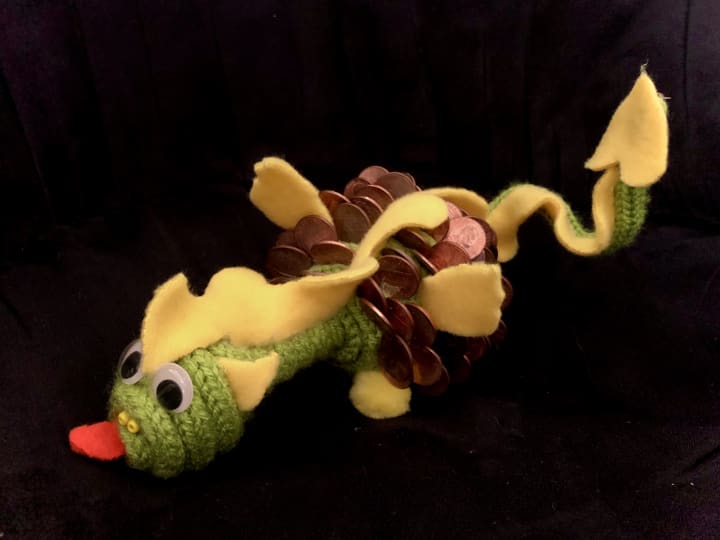 Then the 100 days of school celebration jumped on us, requiring something to present which had a hundred of the same thing. In a store we exchanged $1 for a hundred pennies — but how to present them? They looked like lost scales… My daughter and I made a dragon with a jolly smile and a tongue sticking out — and attached whole hundred pennies to the body as scales…
