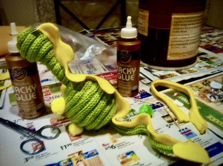 The next step was putting the rope to shape — gluing it to the styrofoam ball created a soft round object, and all I needed to do in order to bring it to life was to add googly eyes and to cut out fleece ears and other details — and soon a cute little pink pig was looking at me from the table.