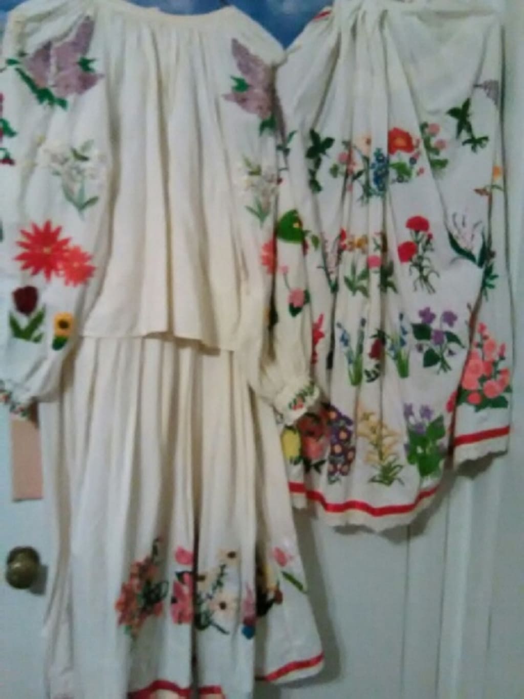 Different patterns were used for the blouse over the years and mine is raglan sleeved. I was in the second wave who joined the group in grade school. We had our own recital and I needed a costume so my mother put me to work. In the time allotted I was able to embroider a full sleeve and half of the other sleeve. There are lilacs, edelweiss, roses, lily pads, tulips, poinsettias, pansies, cacti, and little red flowers on the cuff. I can tell which full sleeve I did by the two colors of green on one of the cacti. It was not deliberate. Oops!
