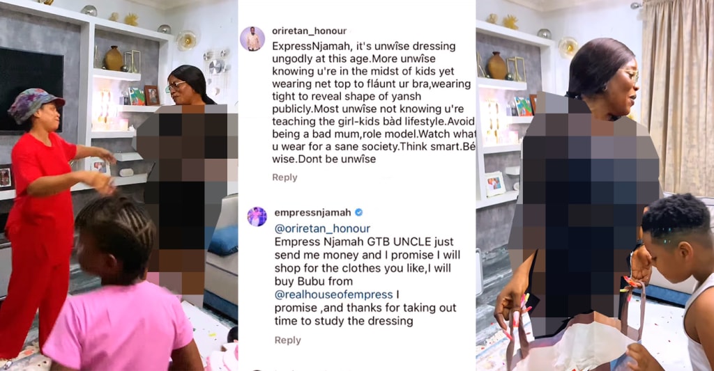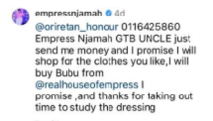 Well, it seemed Empress Njamah shared the same sentiment about the complainer sending her money if he didn't like her outfit. Responding to the original user's disparaging comment, Empress Njamah said: