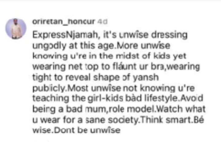 Empress Njamah, it’s unwise to dress ungodly at this age. More unwise knowing you’re in the midst of kids yet wearing a net top to flaunt ur bra, wearing tight to reveal the shape of yansh publicly. Most unwise not knowing you’re teaching the girl-kids a bad lifestyle. Avoid being a bad mum and role model. Watch what u wear for a sane society. Think smart. Be wise. Don’t be unwise.
