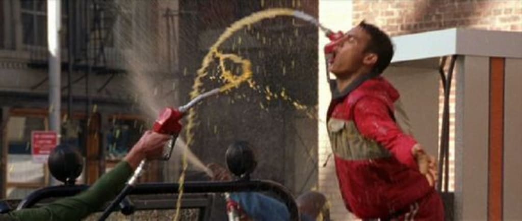 Now, let it be known, that I’ve never done this before, and she said to not let go of the handle trigger, until it clicks. So, there I stood, as a 9-year-old, hand gripped firmly on the trigger, shooting gasoline into our minivan. I don’t know what I’m doing, and would like to be reassured I’m giving a great first performance, so after a minute, I am looking around for Mommy, and turn – pulling the handle out of the vehicle, while gas is ricocheting off of the Armor All and raining down on me, for what feels like, is an eternity, but rest assured, my hand never let go of the trigger. I am drenched in gasoline, much like Officer Marvin Nash from Reservoir Dogs. I look like a mobster who’s trying to get information out of myself; My Mother then comes out of the Shell station.