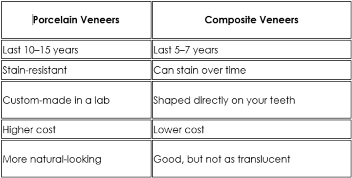 With good care, porcelain veneers can last 10 to 15 years—sometimes even longer. Composite ones tend to last around 5 to 7 years before needing a refresh or replacement.