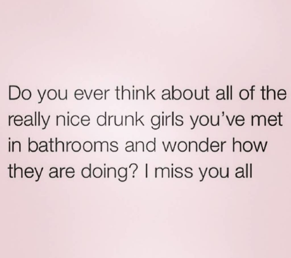 I’d say hear me about but you currently have to in order to judge this piece. It is a meme, it is the truth but drunk girls in the bathroom are how women should be to each other all the time. Supportive, helpful, loving (I think you get the gist). To be honest I am the least empathetic person in the world, however, place me drunk in the girls bathroom and I become a motivational speaker on the level of Opera (just no free cars but rather free gum). Drunk girls in the bathroom is the utopia of a world where men don’t exist. Please do not get me wrong I don’t hate men, this is not a slandering of the male race but rather a reforming of the place.