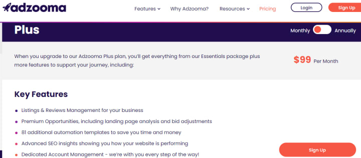 All of their customers get the ‘Essentials plan which is forever free", it has no time period or trial period. But as you and your business grow, you may want more advanced features. That’s why they’ve launched “Adzooma Plus”. To help support customers looking to take their business to the next level. You can get started with the Essential plan completely free.