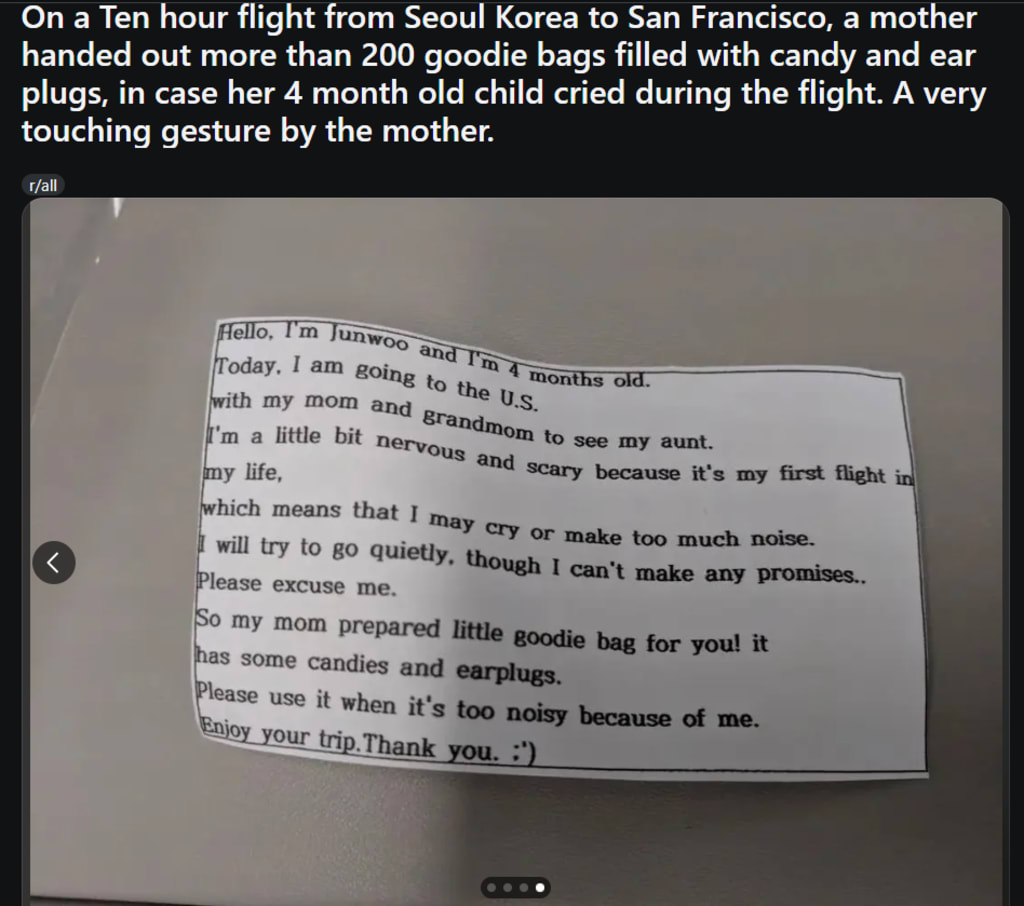 The picture above is the most recent of many viral posts I've seen of parents who have babies and toddlers putting together goodie bags for strangers on their flights. Universally, it seems almost everyone thinks of it as wholesome and "what parents should do if they have to fly with young children." I agree that it is a kind gesture by the parents. But I don't find a woman scared of being harassed over having a child with her to be "wholesome" at all. I just think it's a sad reflection on humanity that parents feel like they need to bribe grown adults to not throw tantrums the second their baby makes any noise.