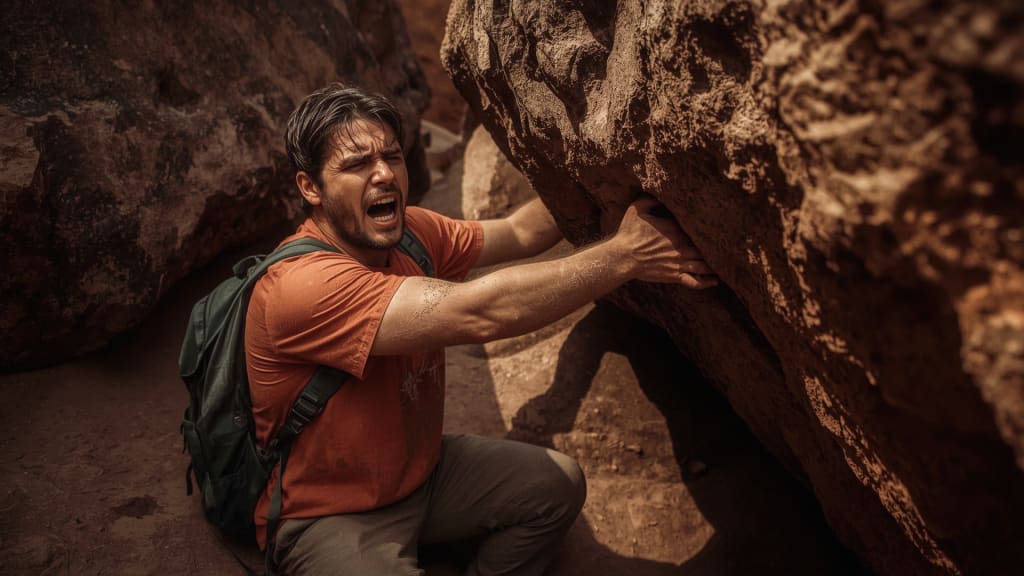 As he moved through the tight spaces between the canyon walls, a massive boulder suddenly shifted. In a split second, it fell and trapped his right arm against the canyon wall. The rock weighed over 800 pounds—far too heavy to move. He was stuck.